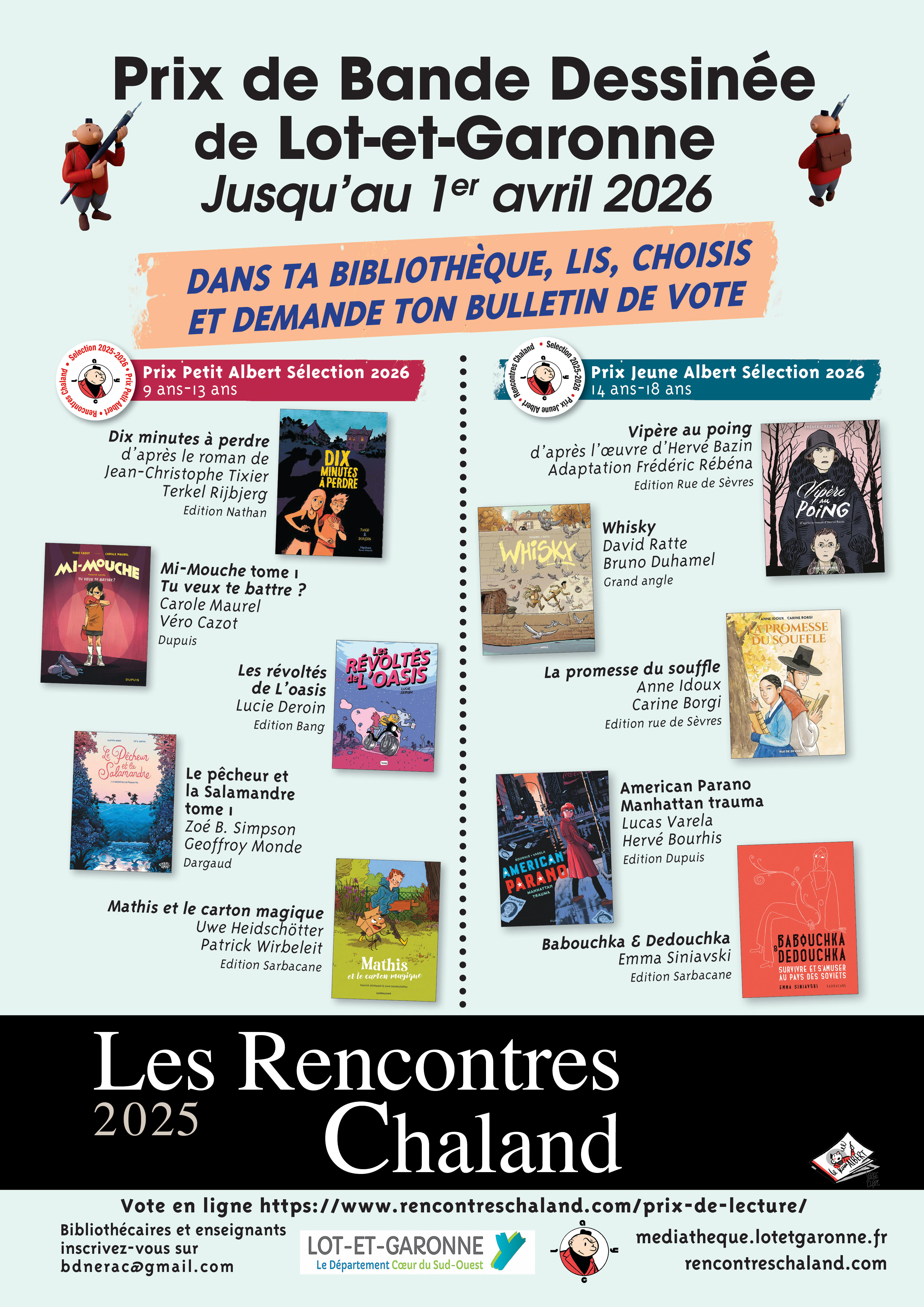 La bibliothèque participe au Prix de bande dessinée du Lot-et-Garonne dans la catégorie Petit Albert (9 à 13 ans) et dans la catégorie Jeune Albert (14 à 18 ans).