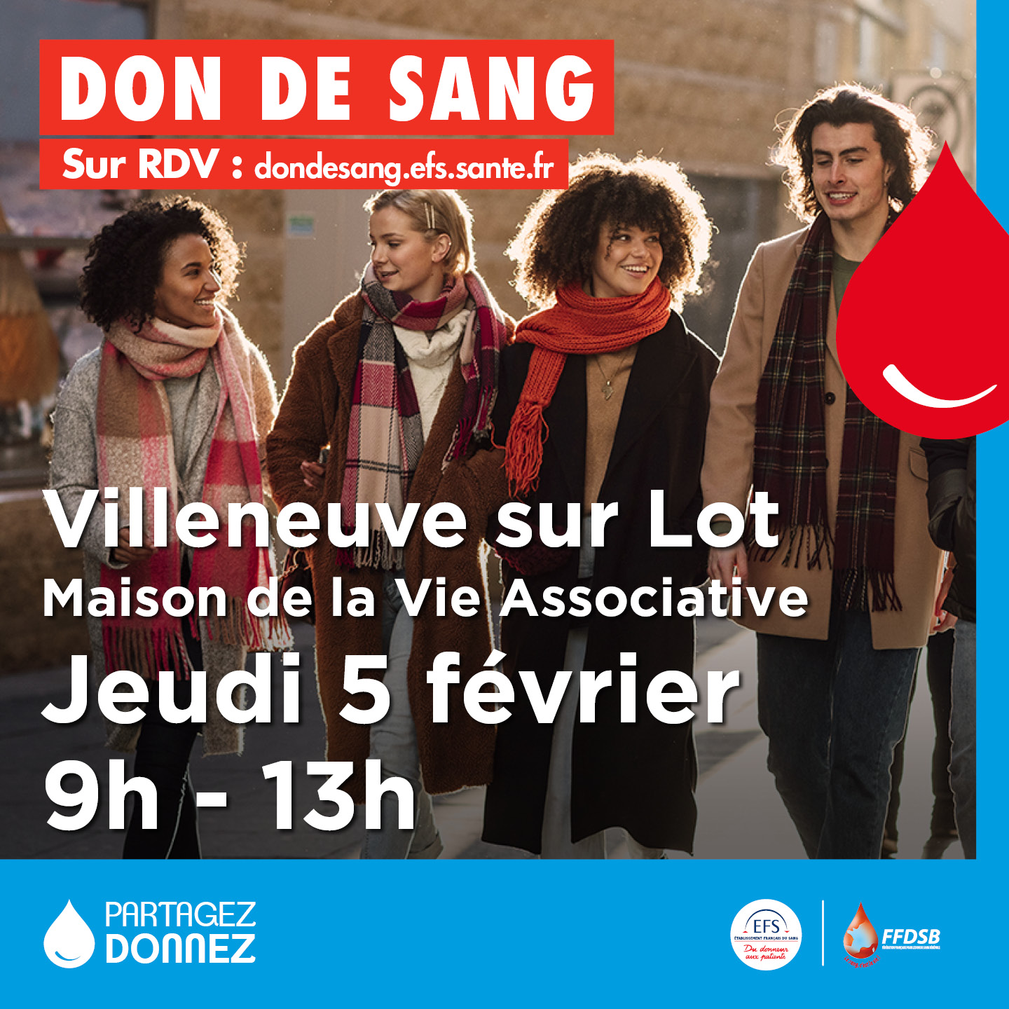 La prochaine collecte de don du sang aura lieu jeudi 5 février 2026 de 9h à 13h à la Maison de la Vie Associative de Villeneuve-sur-Lot.