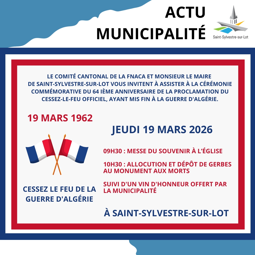 Le 64ème anniversaire du cessez-le-feu de la guerre d'Algérie aura lieu jeudi 19 mars 2026, à partir de 9h30 au monument aux morts et à l'église de Saint-Sylvestre-sur-Lot.