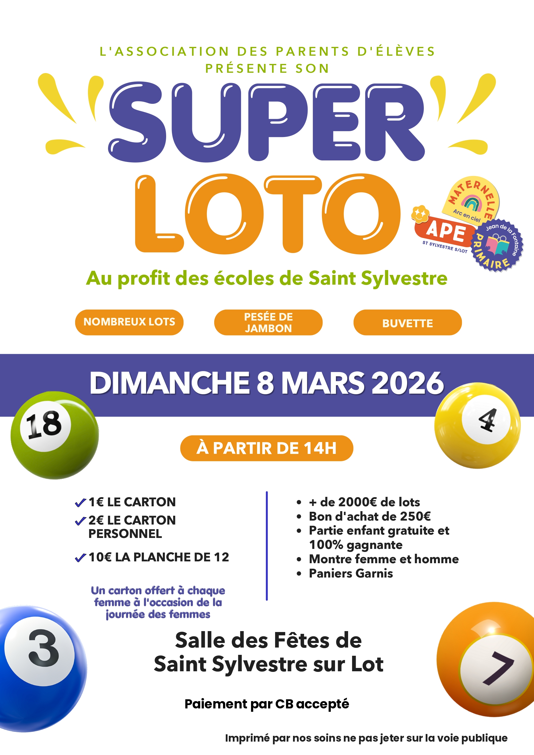 L'Association des Parents d'Élèves des écoles publiques organise un loto dimanche 8 mars à partir de 14h à la salle des fêtes.
