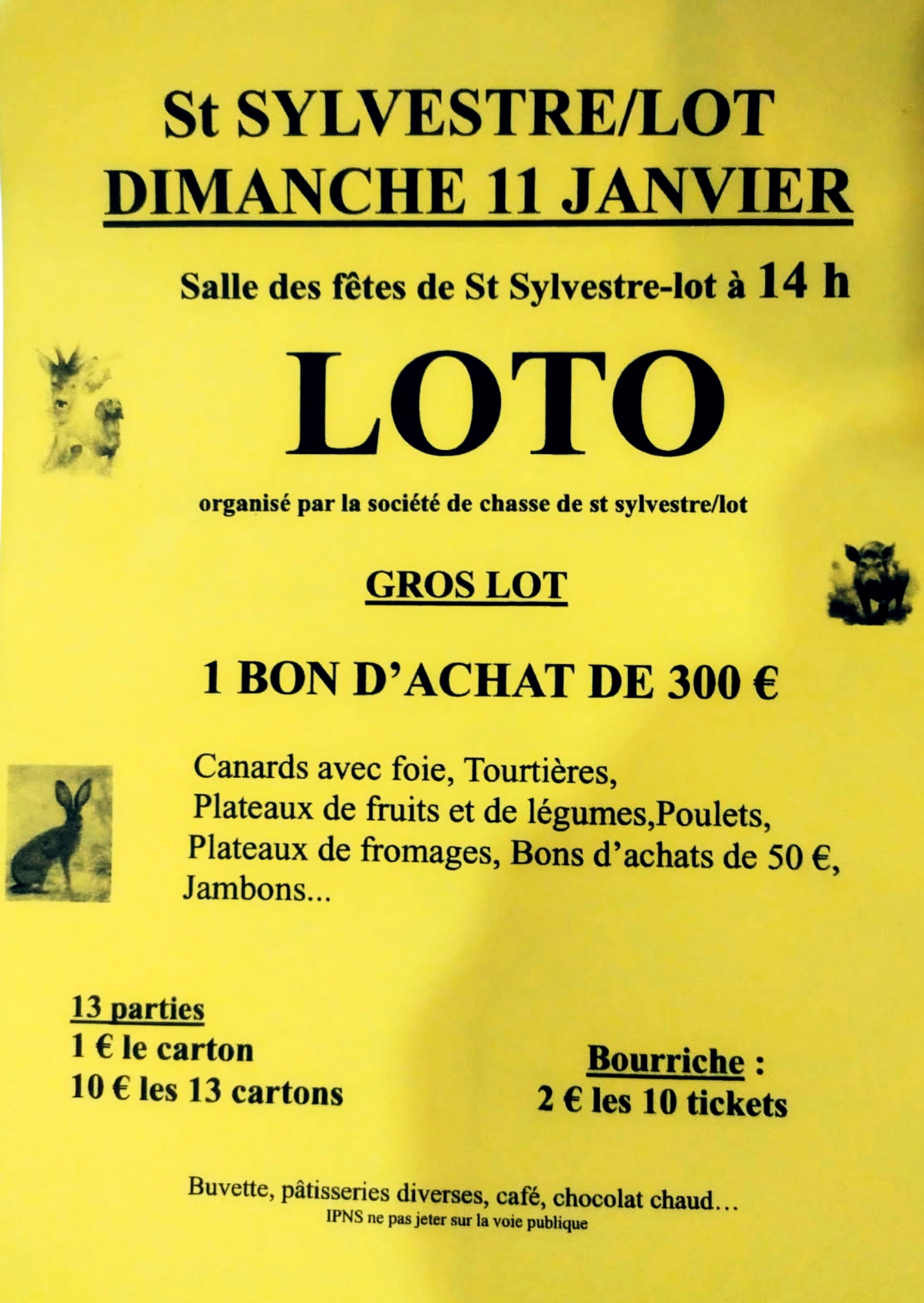 Le loto organisé par la société de chasse de Saint-Sylvestre-sur-Lot aura lieu dimanche 11 janvier à 14h à la salle des fêtes.