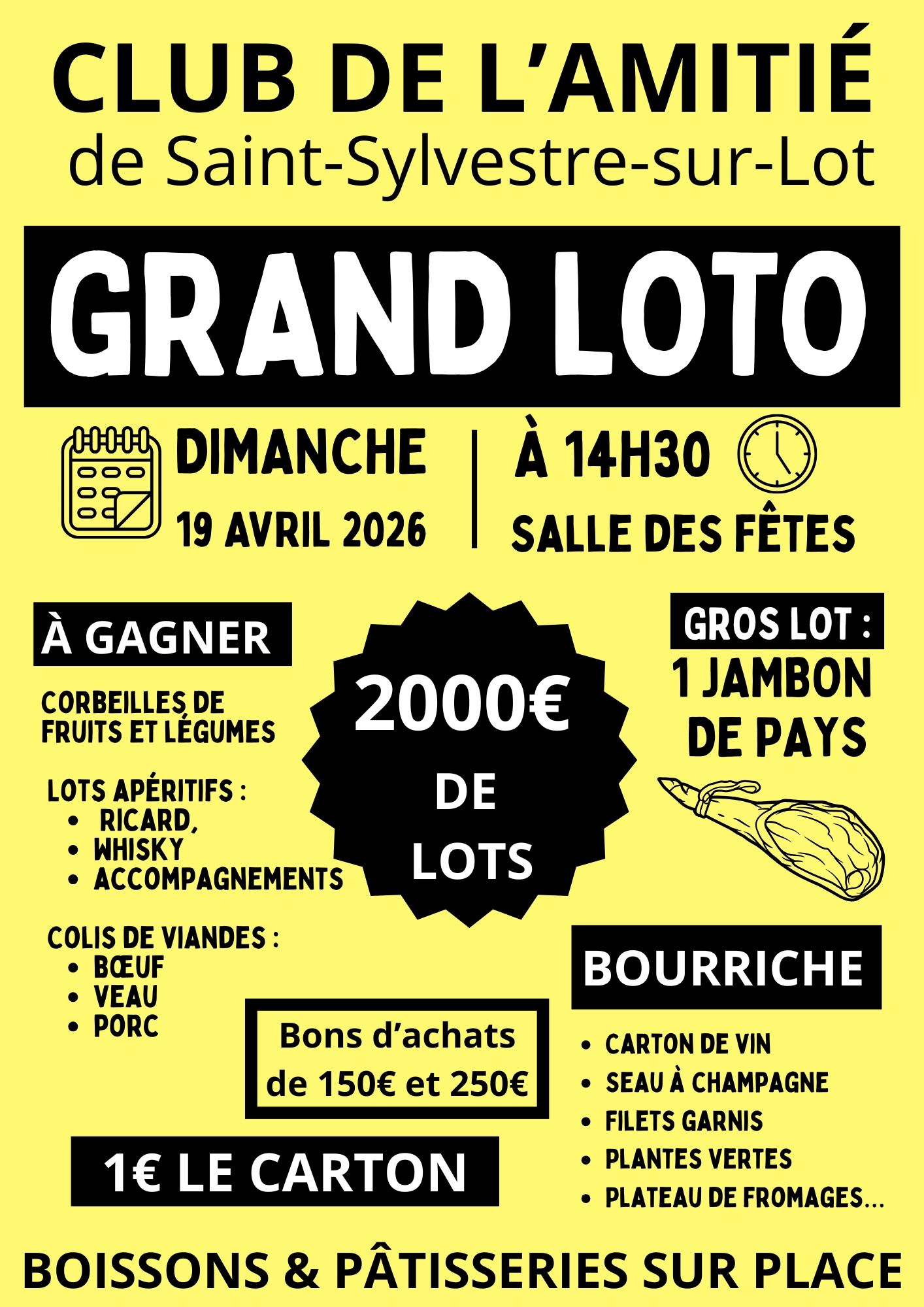Grand loto Le Club de l'Amitié organise un grand loto à la salle des fêtes dimanche 19 avril à 14h30.